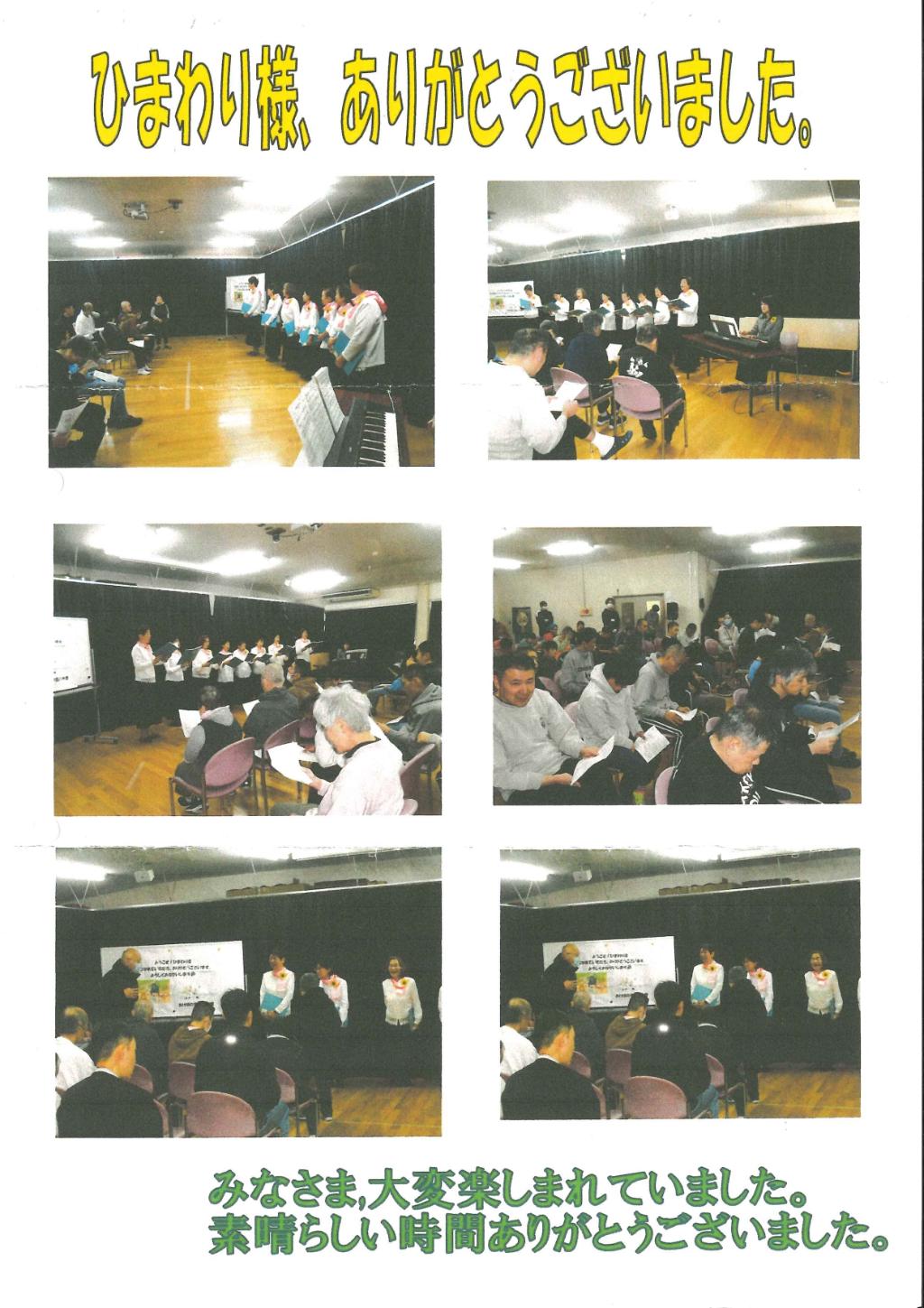 文化祭に出演、あけぼの学園八木寮に行かせてもらい毎月の練習の成果が発揮できました。あけぼの学園さまよりお礼のお手紙をいただき会員みんながうれしく思いこれからの活動の原動力になりました。童話を中心に練習をして何曲か二部合唱もいれて練習を頑張っています。発表会、ふれあい等で皆さんと歌って楽しんでもらえたらうれしく思います。