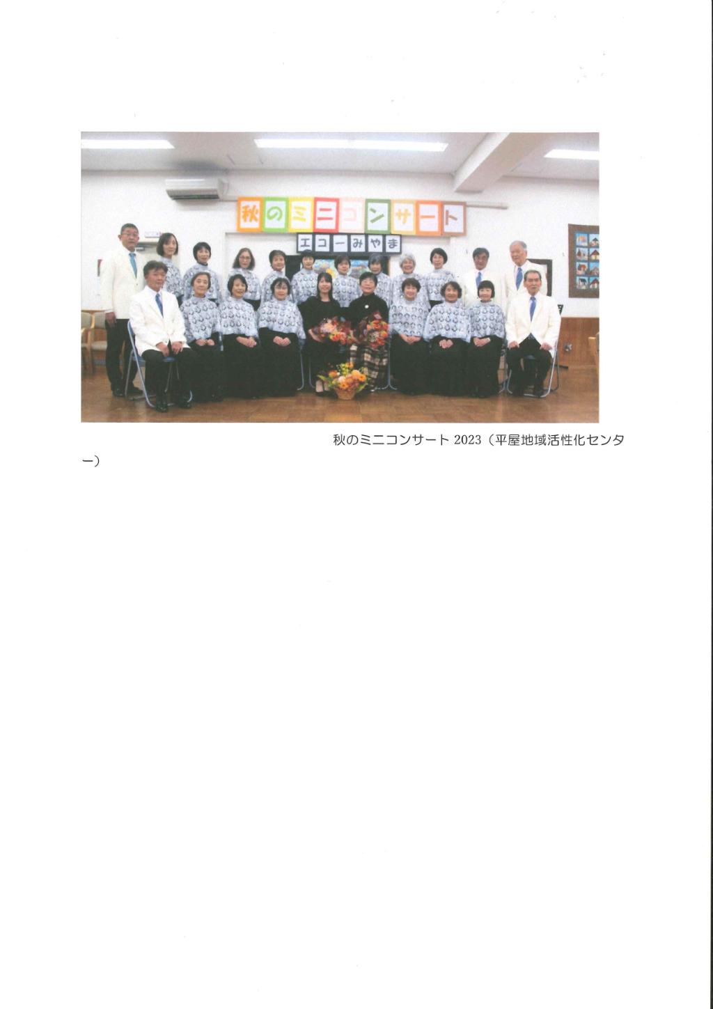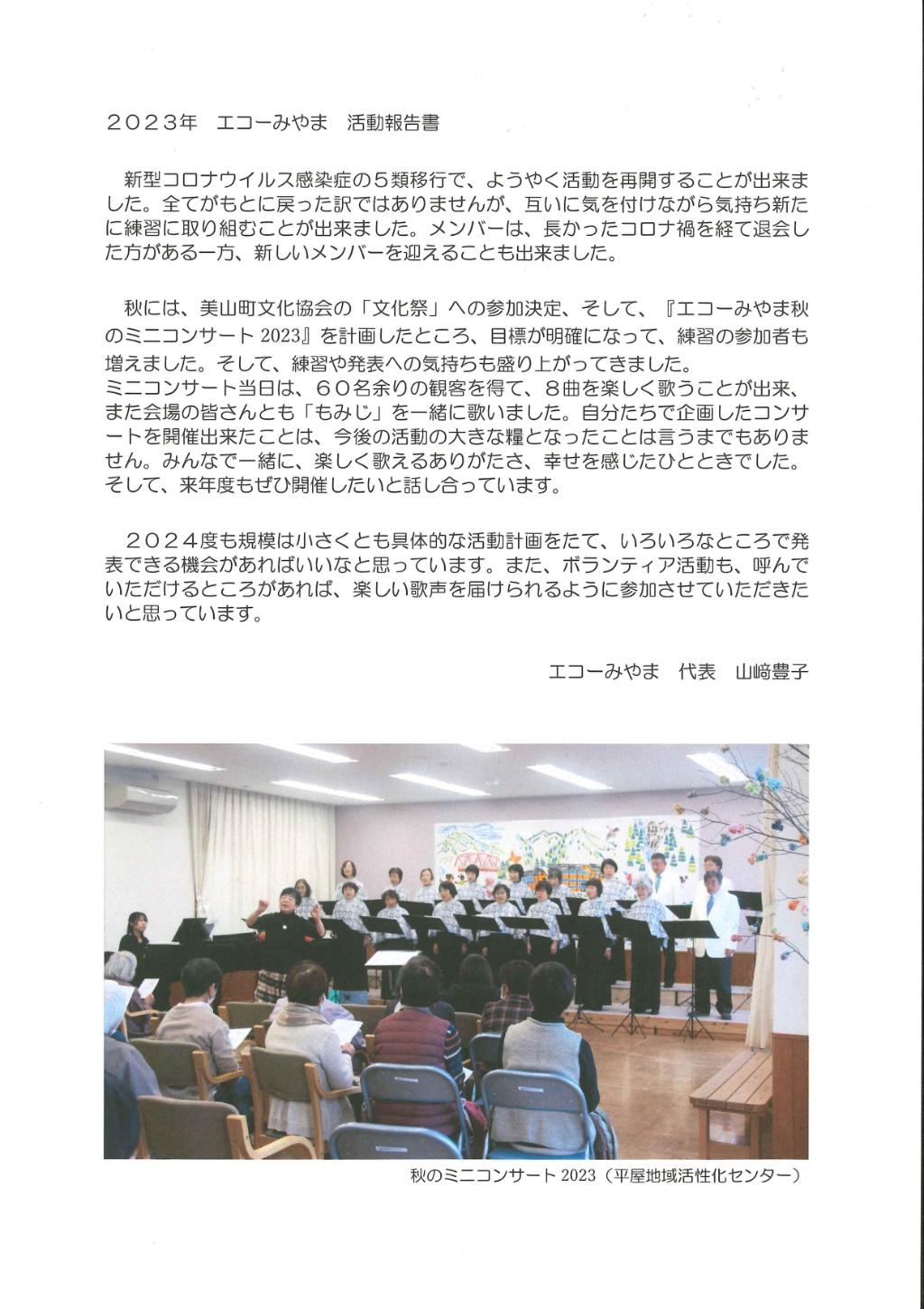 今年度は10/29に美山町文化祭が開催されそれに向けて春から毎月2回の練習を続けてきた。本番が近づくにつれ練習にも熱が入り講師の方(指導者)との楽しいやりとりが増えてきた。又11/18には単独のミニコンサートに取り組む計画を立て役員会で内容の検討をしながら練習に励んできた。いつもの練習場所で多くの来客を迎えて私たちなりのハーモニーを発表することができた。今年は発表の機会も2回ありそれらに向けて力を合わせ練習に励んできました。練習を積み重ねて少しずつですが力がついてきたのを実感しました。これからもミニコンサートを続けていきたいなと思っています。