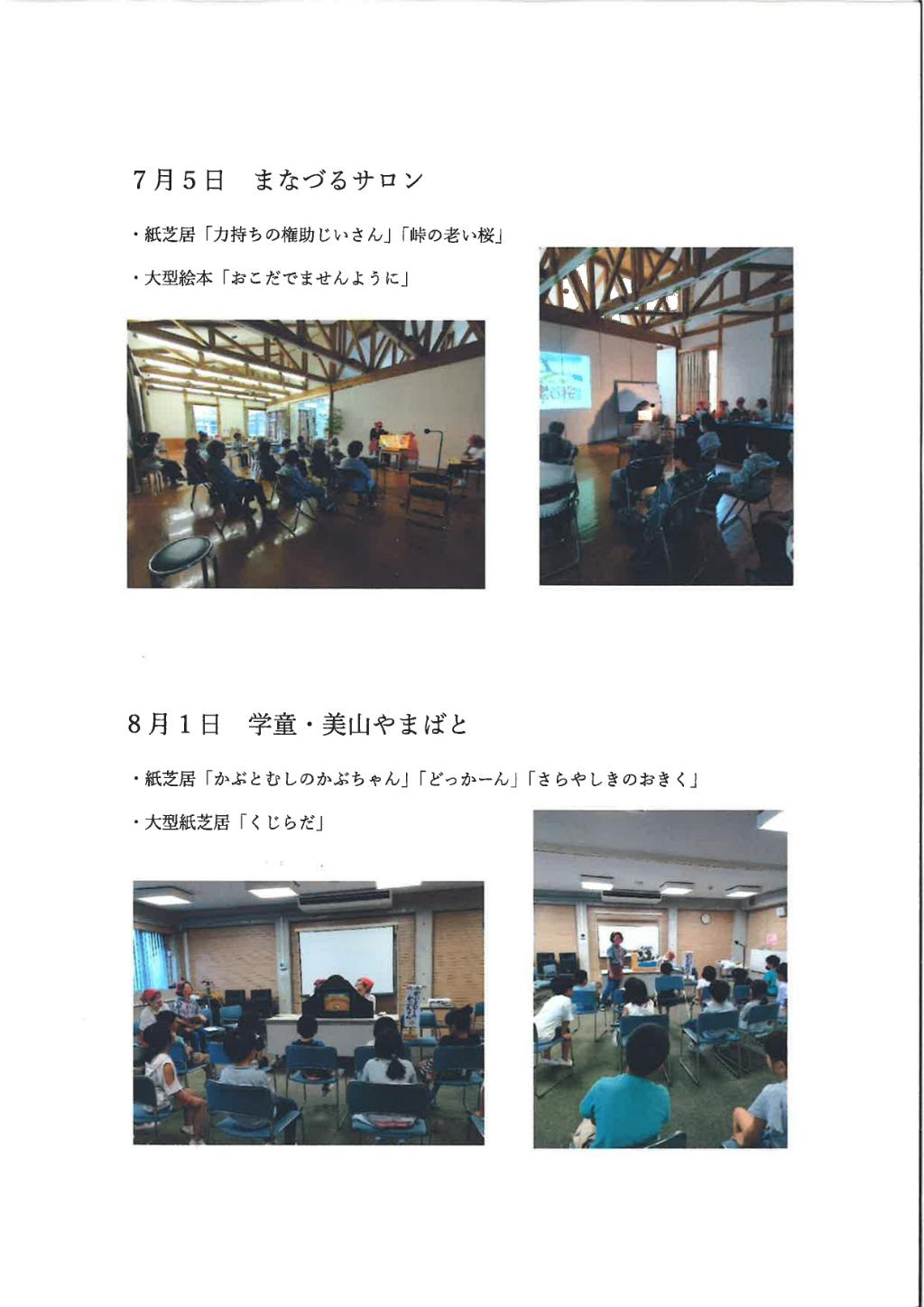 地域に伝わるお話をもとに作成した紙芝居や購入した絵本などを読み聞かせし、皆さんに楽しい時間を過ごしてみらえた。オーディオケーブルを使うことによって大きい音でスムーズにBGMを流すことができ読み聞かせに臨場感を加えることができた。今後も幅広い年齢層の方に絵本や紙芝居を楽しんでもらえる機会を作っていきたい。