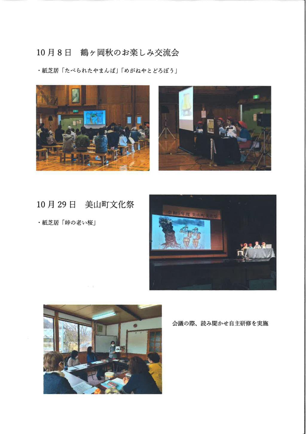 地域の高齢者サロン、放課後児童クラブ、振興会主催の地域住民交流会において絵本や紙芝居の読み聞かせを行った。広い場所での読み聞かせの際、長いオーディオケーブルとCDラジカセを流した。購入した絵本を使って読み聞かせの自主研修を行った。