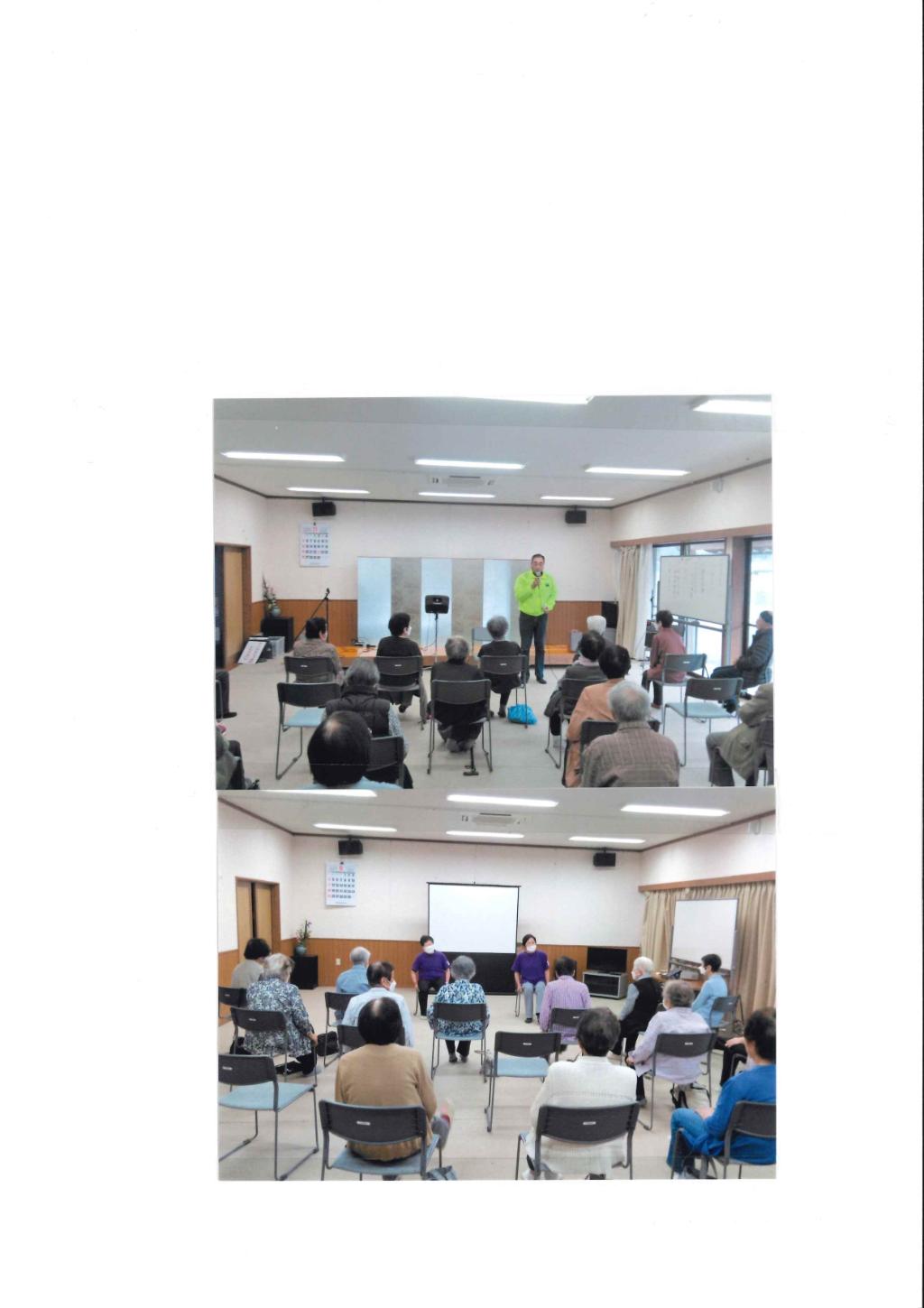 スタッフのユニフォーム購入事業。8名のスタッフが4/2、5/14、6/11、.7/6、9/3、10/8、11/12、12/17、1/17、2/11、3/10の計11回に参加し、参加者329名。毎回健康体操お口の体操を実施。その他舞踊、楽器演奏、手品、落語、ゲーム等により楽しい時を過ごして頂きました。本助成によりスタッフのユニフォームを揃えることができ一体感を持って活動できました。月に一度ですが体操により身体を動かしまた様々な演目ゲーム等により楽しく会話し笑い合えることで気力体力の向上が図られた。
