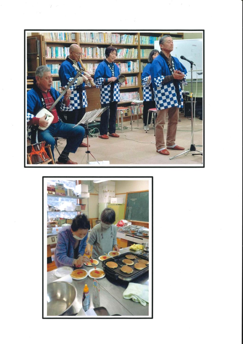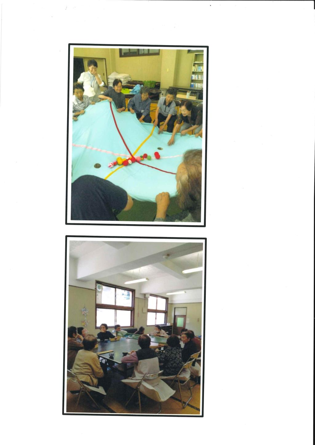 ●第1回目(4/20)ペットボトルとビー玉を使ってボードゲーム作り●第2回目(5/18)小浜方面へお出かけ●第3回目(6/15)七夕に向けての飾り制作と飾り付け●第4回目(7/20)脳トレグループの歌に合わせて指や手の運動を行う●第5回目(9/21)地域の人形劇サークル「そら豆」による(おだんごどっこいしょ、やまんば、どんとこい)の演目と(三途の川)という紙芝居を鑑賞●第6回目(10/18) 卓球バレーを行う●第7回目(11/16) 毎年恒例の干支の押絵作成を行う●第8回目((12/21)地域の方の手品を鑑賞し、クリスマス会を実施●第9回目(1/18)地域のピザ屋さんの指導を得てピザづくりを行う●第10回目(2/15)旧知井小学校の調理室を使ってホットケーキ作りを行う●第11回目(3/15)地域の民謡サークルの方々による民謡の鑑賞