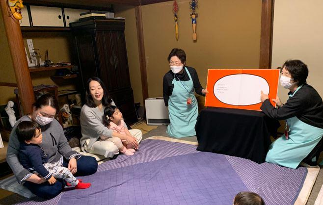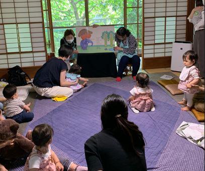 はじまりの歌、名前の紹介の歌を歌って始める。絵本・紙芝居を読んだら手遊び歌などをして、赤ちゃんやお母さんがリラックスしてお話が聞けるようにと心がけ、和太鼓の演奏を身体で楽しむ。