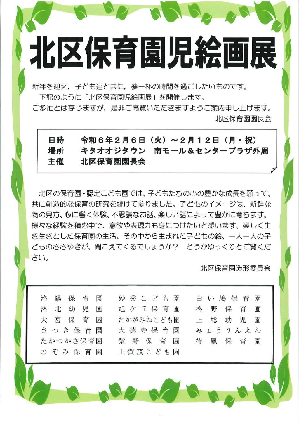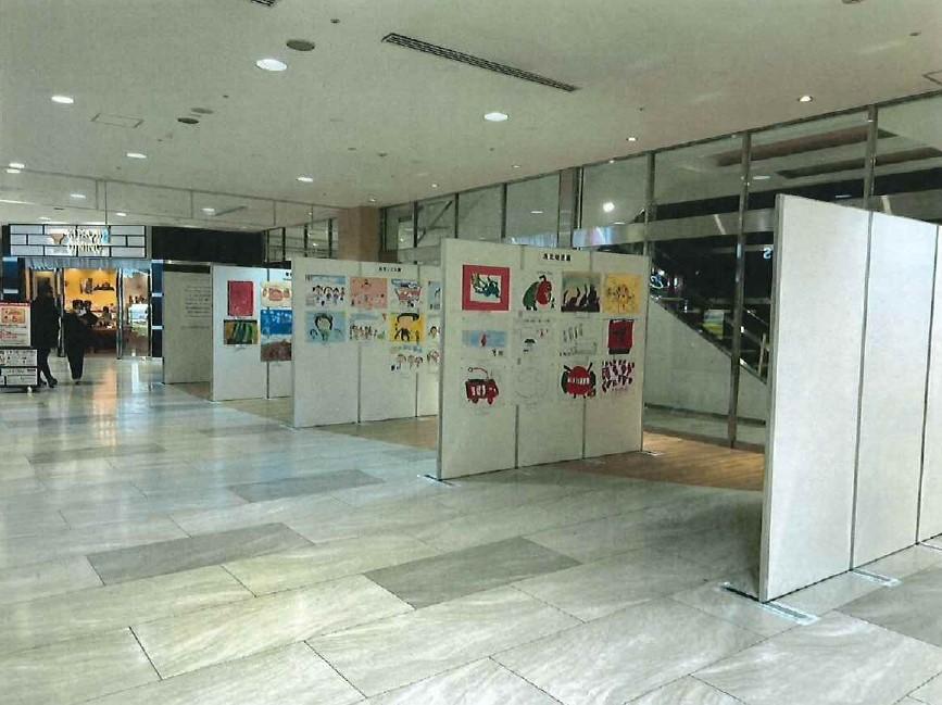 社会福祉協議会様から費用を助成を受け、北区では比較的人の往来があるイオンモール北大路の1階において、今年も無事に、北区の保育園及び認定こども園17ケ園が参画し地域の子ども達の絵画の展示を行う事ができました。