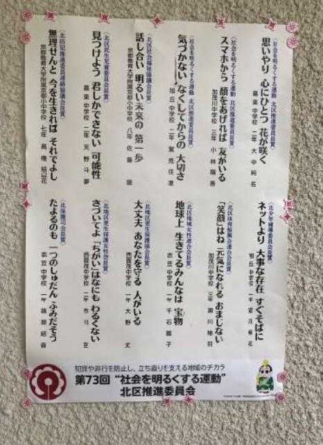 北区内の小・中学生への作品募集依頼、作文回収及び審査、優秀作品集作成、北区関係団体等へのブックレット送付、優秀者への賞状贈呈、作文応募者全員への参加賞贈呈(※京都府推進委員会各賞に2名(小学生1名・中学生1名)が受賞する