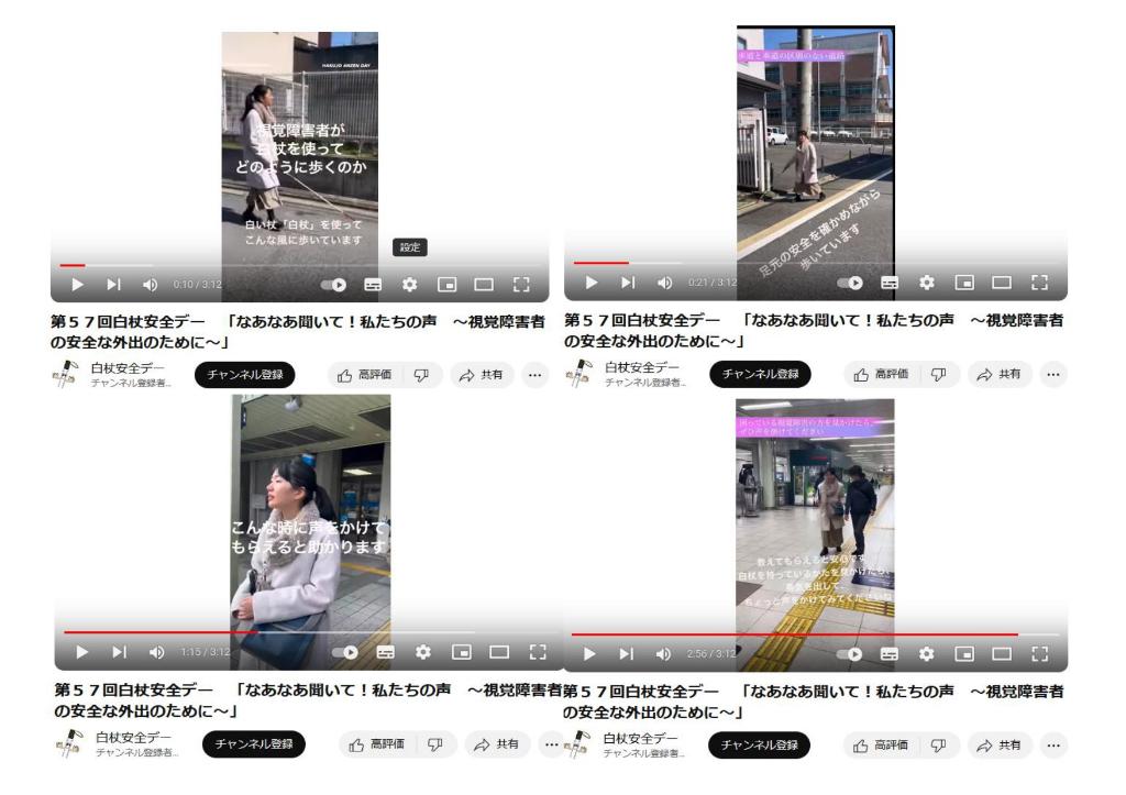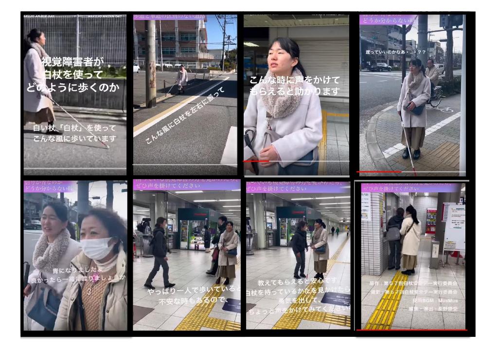 内容は、白杖歩行の視覚障害者が実際に街中をどのように歩いているのか、そしてどのような場面で声をかけてもらえると助かるのかについて、動画にまとめた。昨年度作成した動画は5分程度のものだったが、特に若年層の視聴者にとっては、より短い動画の方が好まれるということから、上記の内容をコンパクトに2分程度のものとした。