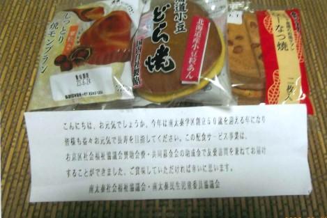 今年は学区創立50周年の年にあたり、和菓子(三種類)を友愛訪問を兼ねて手渡し、メッセージを添えて。【総事業費:172,500円】
