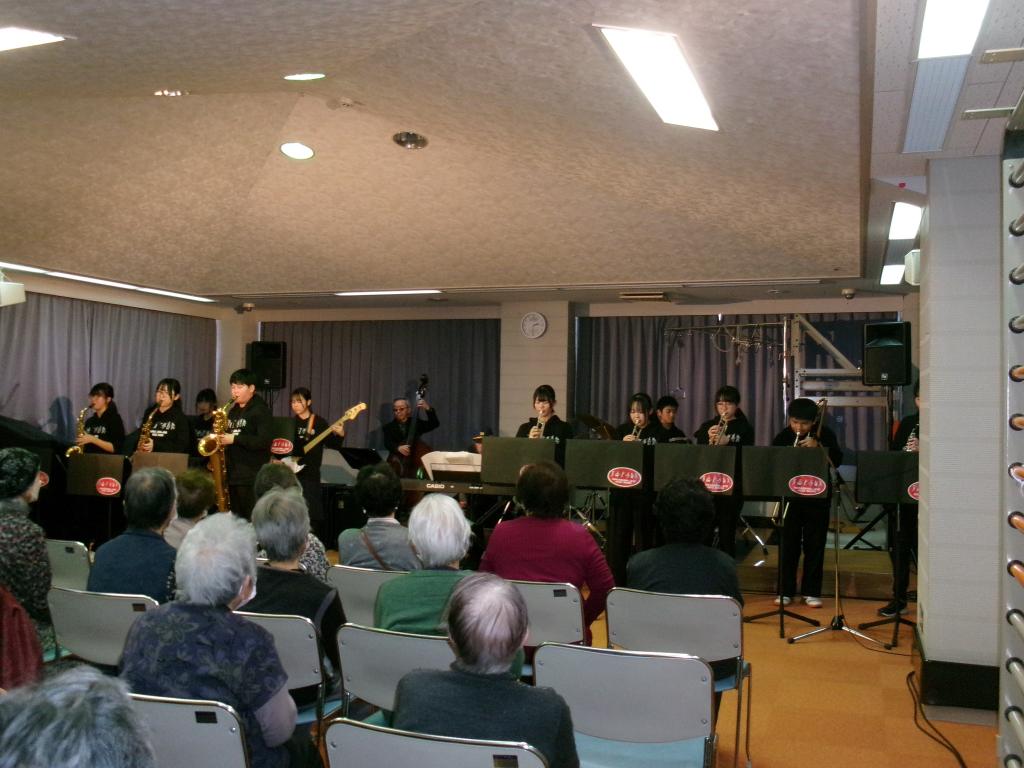 12月14日(土)老人福祉センター南郷において、世界的ジャズピアニストのデイヴィッド・マシューズさん率いるマシューズトリオと中沢中学校ジャズバンド部によるクリスマスミニコンサートを開催しました。さまざまなジャズの名曲を演奏していただき、会場は大変盛り上がりました。参加した利用者からは、「コンサートに行く機会がないので楽しい時間を過ごせました。」「生演奏で迫力があって楽しかった。」といった感想が寄せられ、皆で楽しいひと時を過ごすことができました。