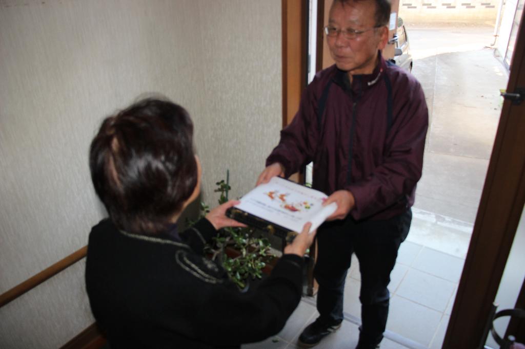 町内のひとり暮らし高齢者に、歳末に民生委員がクリスマス料理を届ける。
