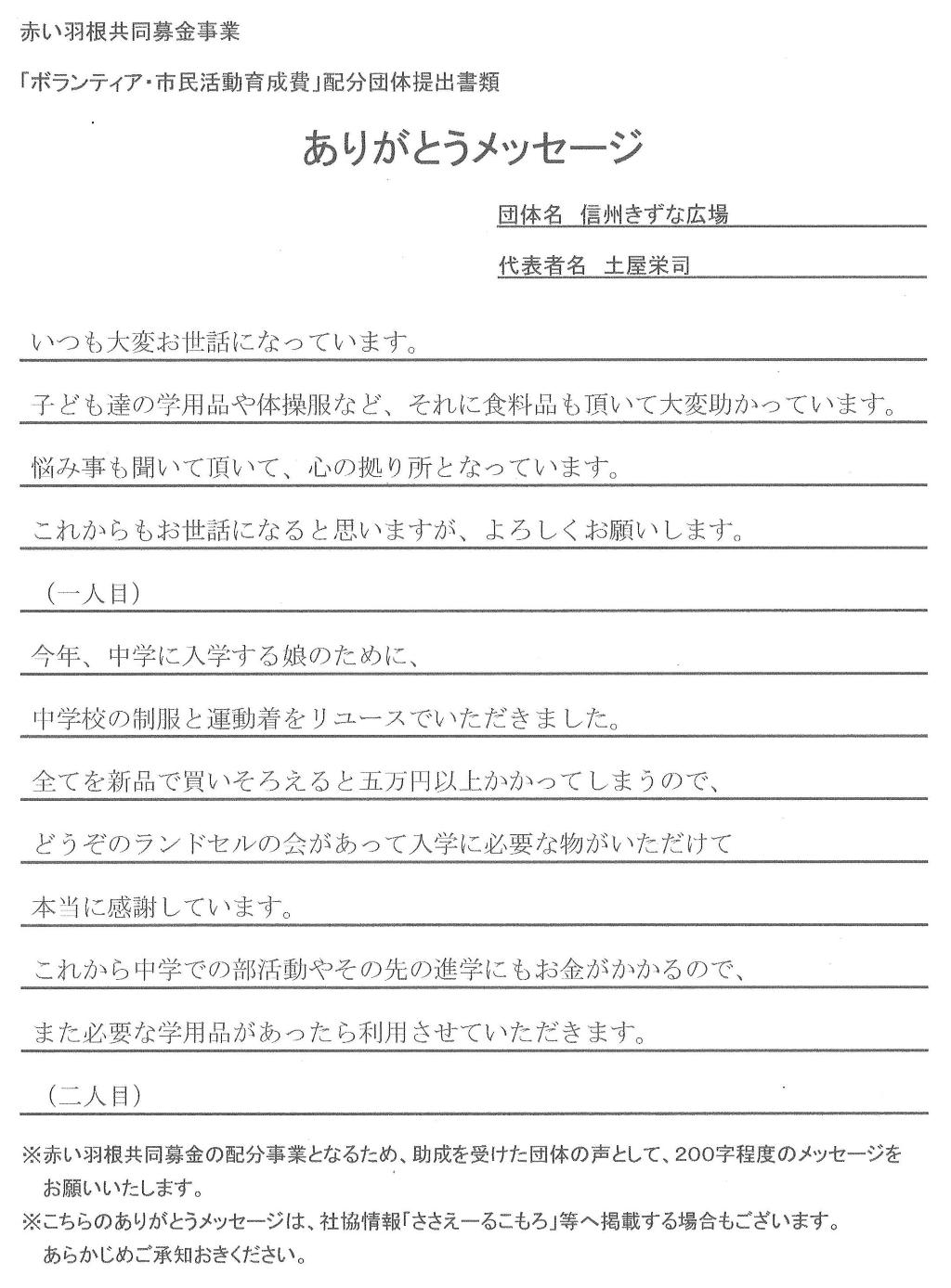 | 活動内容の補足事項 | 制服、運動着、学用品、ランドセル、食料品等を渡し、苦しい子育て家庭を支援する。 |
