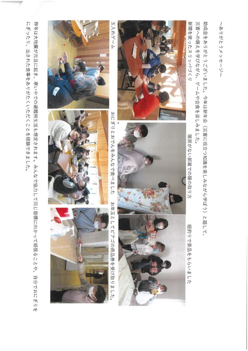 助成金をありがとうございました。今年は新年会(災害に役立つ知識を楽しみながら学ぼう)と題して、災害への備えを学びながら、ゲームや会食を楽しみました。