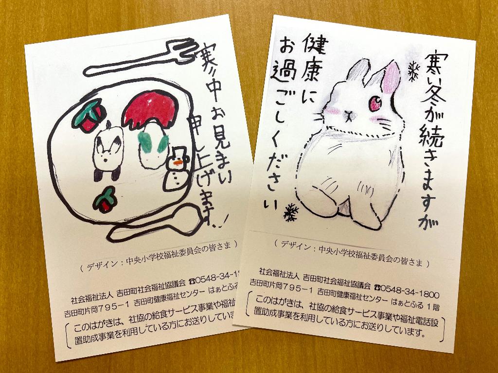 孤立や孤独感の軽減、見守り、相談しやすい環境づくりを目的として町内在住のひとり暮らし高齢者(給食サービス事業及び福祉電話設置助成事業利用者)を対象とし、寒中見舞いの絵はがきを送付します。はがきのデザインは、町内の小学生等吉田町に住む皆さまが考えたものを使用します。
