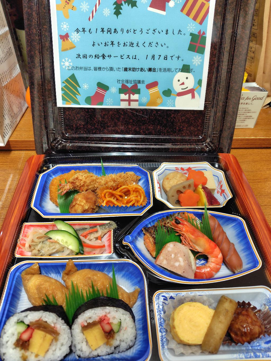 歳末助けあい募金を財源に、仕出し屋さんに歳末助けあいお弁当を作ってもらう。そのお弁当を本会の福祉給食サービスを利用されている見守りが必要なひとり暮らし高齢の方等を対象に、ボランティアや職員が自宅へ届ける。対象者が元気に過ごされているかの安否確認を行い、安心して新年を迎えてもらう。