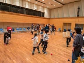 ・親子で風船運び、追いかけ玉入れ、体操