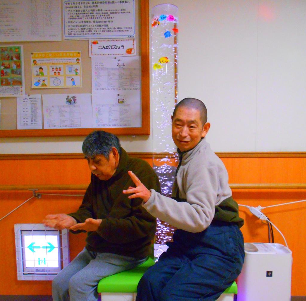 普段は他の方とトラブルになることも多い利用者さまがバブルの柱の周囲のソファに座り、柱に抱き付かれたり、耳を当てて泡音を聞いて、リラックスした表情をされる姿がみられました。通りかかるたびに光や泡を見て「きれいやなあ」「かわいいな」という声が聞かれ、来園者にも自慢しているように案内する利用者さんの姿があり、設置後から玄関前ホールのシンボルのようになっています。
