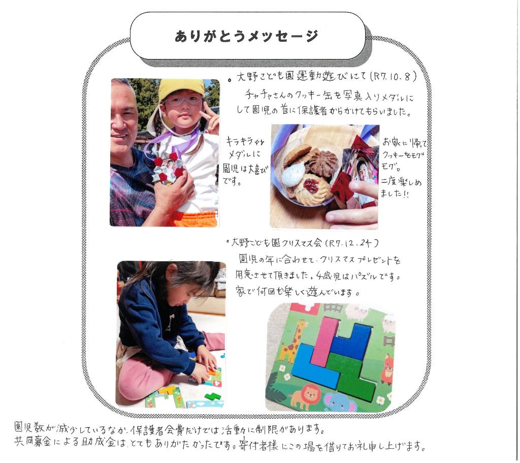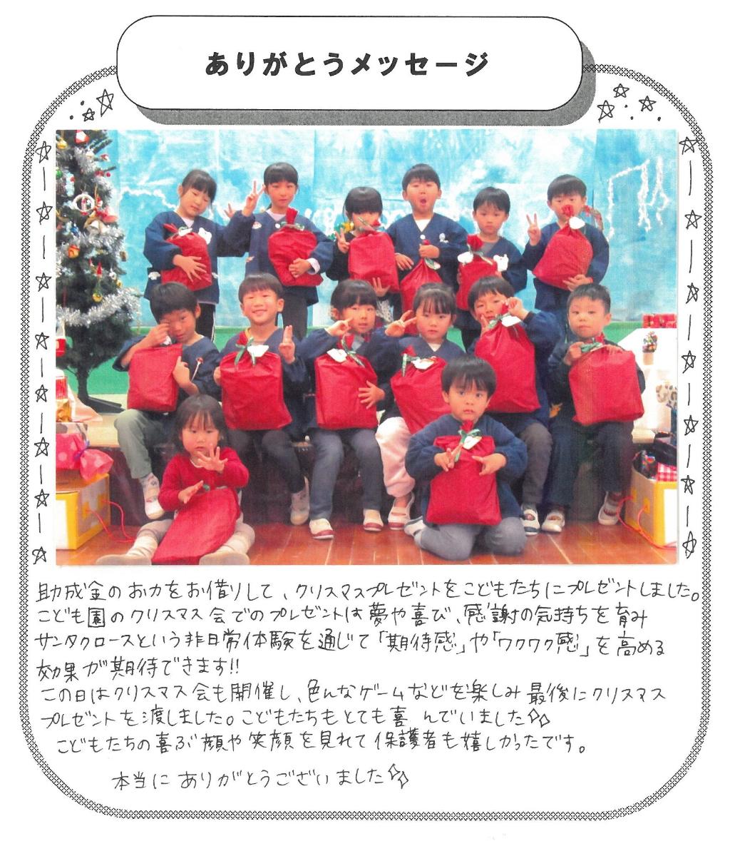 山吉田こども園は令和7年度をもって閉園となることが決定し、今年度のイベントは全て山吉田こども園最後のイベントとなりました。助成金のおかげで園児たちにプレゼントを配ることができ、子どもたちの素敵な笑顔を見ることができました。