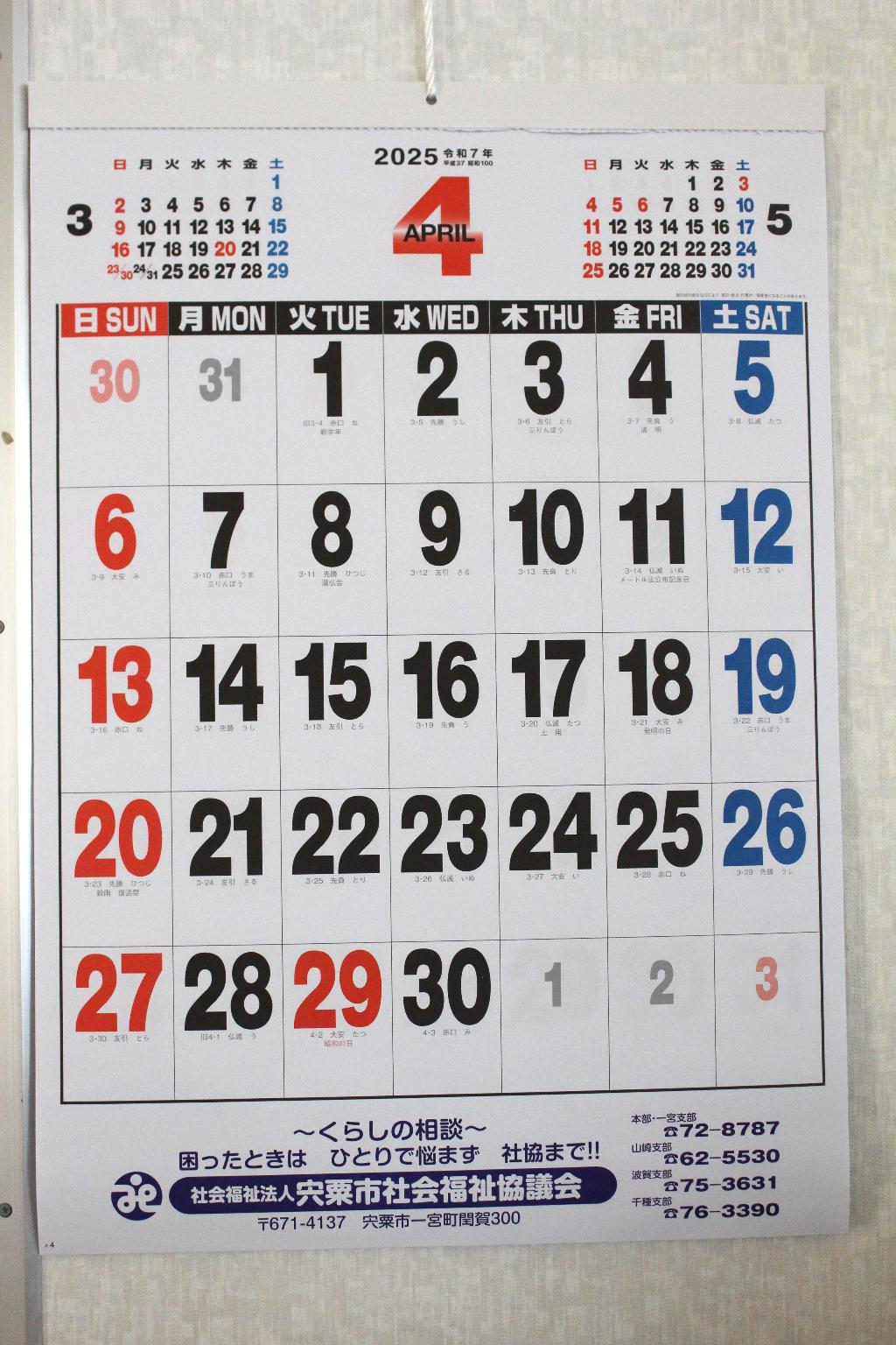 75歳以上の一人暮らし高齢者に、「くらしの相談、お困りごとは、社協へ!!」と印刷した大版のカレンダーを配布しました。配布は民生児童委員に協力いただき安否確認を兼ねて行いました。