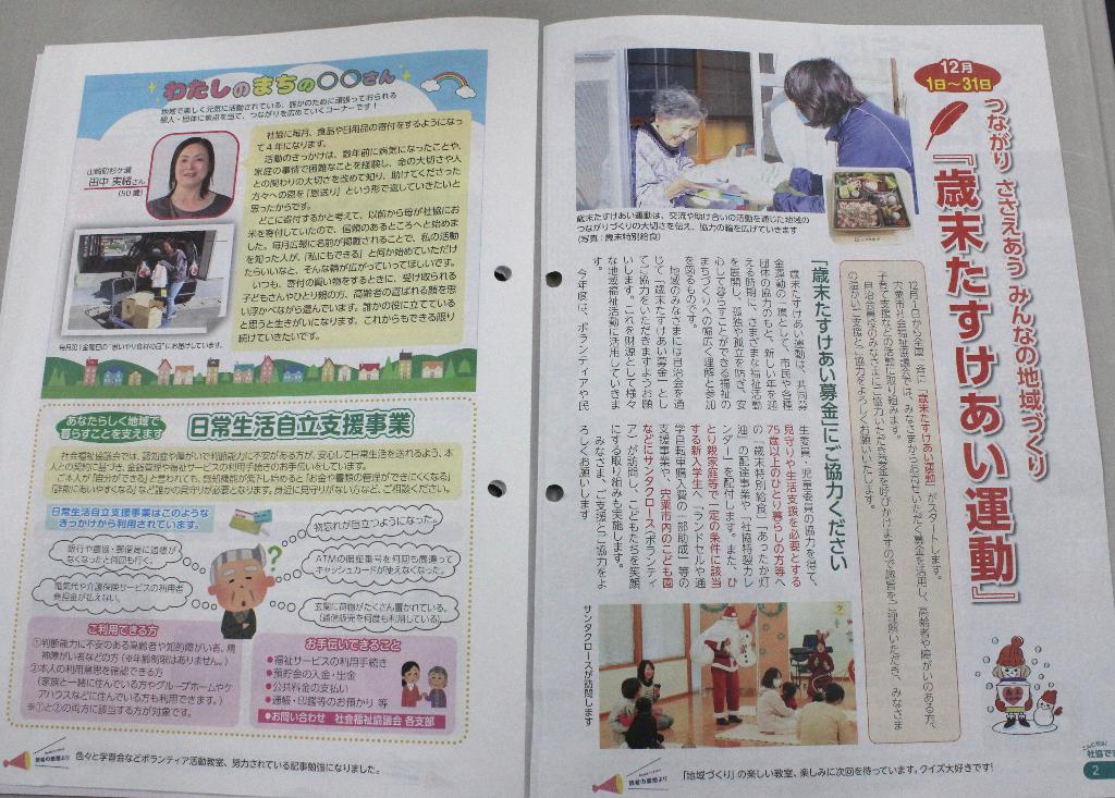 広報啓発事業(歳末月間前後に関係記事を掲載)として宍粟市社協の機関紙の発行費、作成費に活用する。