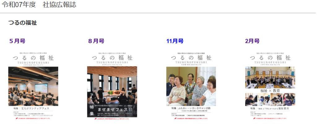 社協広報誌「つるの福祉」を年4回(5月、8月、11月、2月)発行し、住民に社協活動、共同募金、ボランティア活動、老人クラブ活動等の情報を提供する。