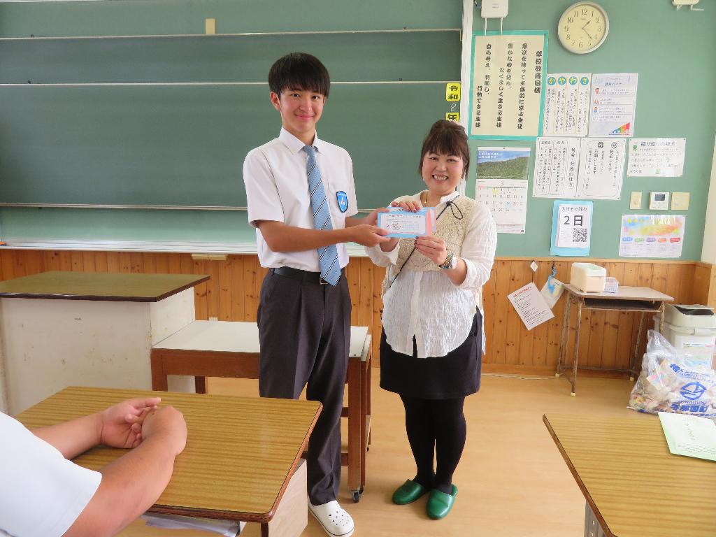 15歳で島を離れる中学生の卒業生へ図書カードの配布を行う