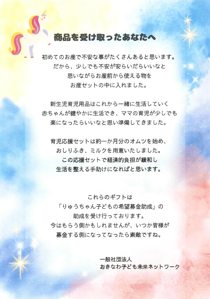 物品をお渡しした方へ、寄付者のお気持ちを伝えたいと考え手紙を同封。助成を受けて活動ができていること、ゆくゆくは助ける側へ行ってほしいことをしたためました。★テンションのあがる可愛いグッズありがとうございました。楽しんで子育てできそうです★子どもが5人いるので大変助かります。