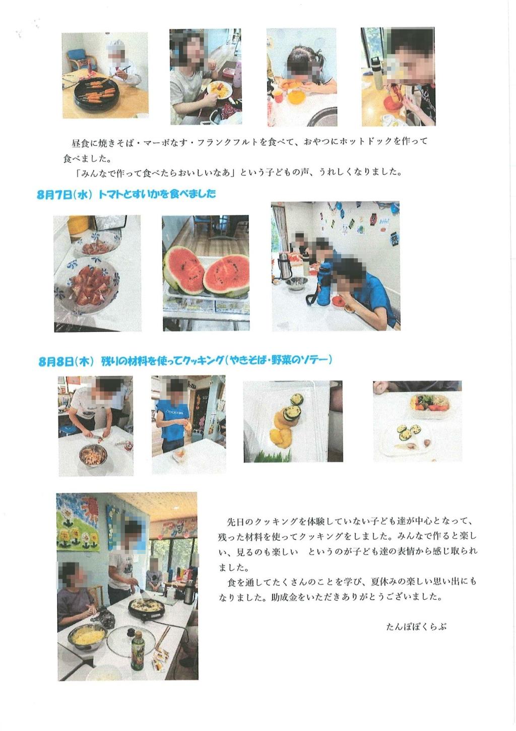 利用者様が協力し合って一つのことを成し遂げたことにより信頼関係を築いていただくことができました。「みんなで調理したものをみんなで食べるとより一層美味しく感じる」との声を利用者様からいただくなど、調理体験だけではない様々な経験を積んでいただけたのではないかと考えています。また、調理を通じて食への関心を高め、食事の大切さを学んでいただく機会となりました。事業所としても、利用者様が積極的に取り組まれる姿を拝見し、利用者様ができることが多岐に渡っていることについて新たな発見もあり、双方ともに良い時間を過ごすことができました。利用者様の保訛者の方にも良い報告ができ、調理体験を通じて食育を学ぶという大変貴重な経験を積ませていただくことができました。利用者様も自らが調理したものは美味しかったと言っていただいたことが事業者にとって何よりの喜びです。ご寄付いただき誠にありがとうございました。