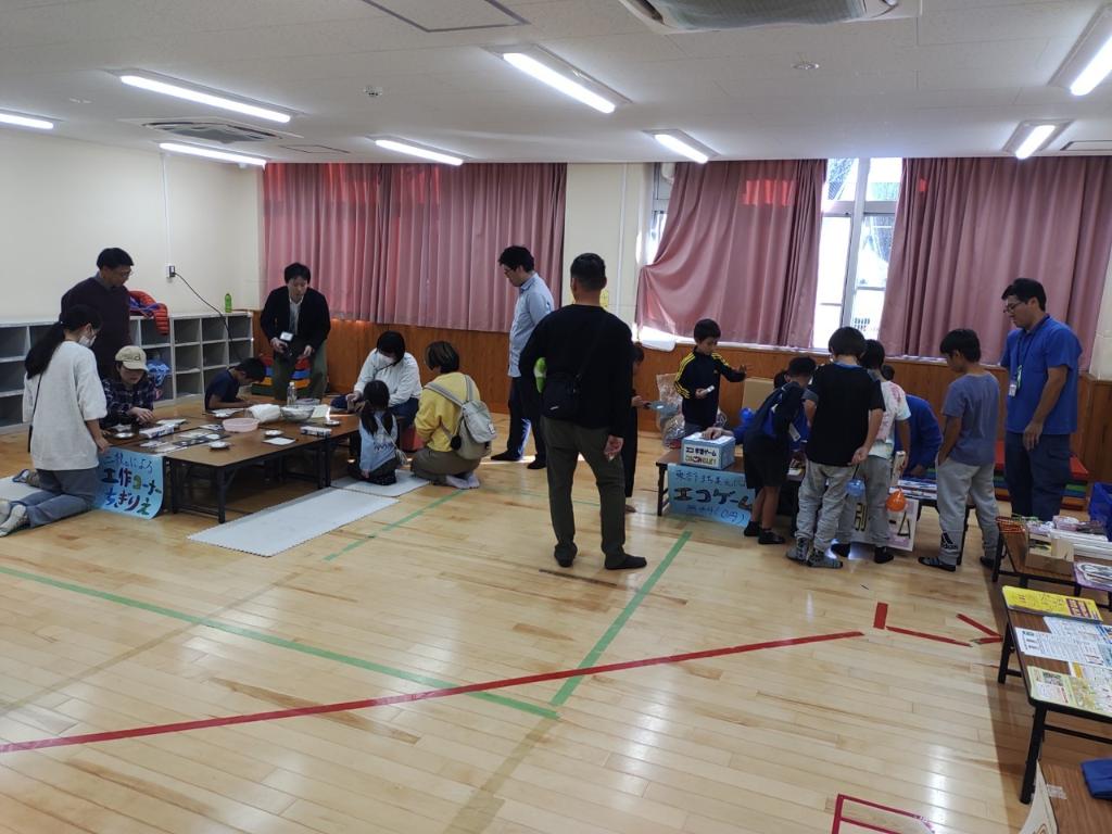 前年度までは、冬に開催をしていましたがインフルエンザ、ノロウイルス等の感染症の流行に伴い参加者が少ないため今年度は秋に開催をしました。子どもたちとも相談し今年のおまつりは飲食コーナーを設け各コーナー(輪投げ、魚釣り、ラダーボール、フランクフルトなど)担当の声掛けをし保護者、中高生、小学生、大学生ボランティアのお手伝いもたくさん来てくれました。またふれあい共生館HAPSにおられた方による「和紙工作コーナー」や東部まち美化事務所さんの「分別クイズゲーム」など盛りだくさんのコーナーを展開しました。また、保育所とも隣接をしているためたたくさんの乳幼児親子さん、地域の方、小学生の一般来館の親子さんの参加も多く見られました。すごくに賑やかなふれあい児童館まつりとなりました。